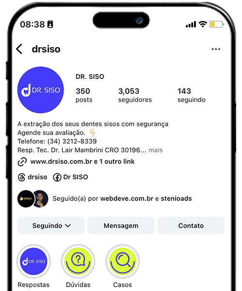 Trustindex verifica se a fonte original da avaliação é Google. Extrai 4 dentes sisos com o Dr lucas, medico super atencioso com paciência me explicou como seria a cirurgia com isso ja me deixou um pouco mais calmo e gostei muito que minha boca não inchou não senti dor.Publicado em fernando cardosoTrustindex verifica se a fonte original da avaliação é Google. Equipe espetacular,todos muito atenciosos, tratamento com carinho e atenção,muita gratidão a todos da equipe Dr siso.Publicado em Vania FreitasTrustindex verifica se a fonte original da avaliação é Google. Procedimentos rápido, sem gerar qualquer estresse ao paciente! Ótimos profissionais!Publicado em Glaydson Barbosa FerreiraTrustindex verifica se a fonte original da avaliação é Google. Só tenho a agradecer. Todos muito educados preocupados com o bem estar do paciente.Doutor Lair muito experiente passa confiança e segurança. Doutor Lucas atencioso e cuidadoso.Obrigada a toda equipe!Publicado em clautia mouraTrustindex verifica se a fonte original da avaliação é Google. a melhor clínica da vida, mudou totalmente minha visão sobre dentistas, muito atenciosos e preocupados tanto pré, durante e pós operatório, não tem melhor escolha de clínicaPublicado em Isabella OliveiraTrustindex verifica se a fonte original da avaliação é Google. Com certeza escolher a DR. Siso, para a minha cirurgia de retirada dos 4 sisos, foi a melhor escolha que eu poderia ter. Foi tudo maravilhoso desde o primeiro contato, na recepção, até o pós operatório. Na avaliação mesmo o Dr. Lucas já te passa muita segurança e tira todas as dúvidas, durante a cirurgia é super tranquilo e se preocupam em te deixar sempre confortável e sem dor. Eu em especial, tinha um medo incalculável, fiz com sedação, que me tranquilizou 100% na hora da cirurgia, e enfim tive todo suporte no pós, não senti dor NENHUMA, em momento algum, que nem eu mesma acredito. Incrível demais, já retirei os pontos, a recuperação está sendo excelente, e indico muito, de olhos fechados! Parabéns a toda equipe!Publicado em HelenTrustindex verifica se a fonte original da avaliação é Google. Ótimo atendimento! Profissionais extremamente capacitados e atenciosos. Durante todo o processo de pré e pós operatório eles entram em contato constantemente para saber se está ocorrendo tudo conforme o planejado. Com certeza indico para quem pedir.Publicado em Felipe Mendes RamosTrustindex verifica se a fonte original da avaliação é Google. Atendimento bom, pessoal atencioso e rápidoPublicado em Joao VictorTrustindex verifica se a fonte original da avaliação é Google. Equipe super acolhedora e receptiva!!Publicado em Gabryelle MouraTrustindex verifica se a fonte original da avaliação é Google. Dr. Lucas, profissional extremamente competente de um atendimento diferenciado e um pós cirúrgico perfeito, recomendo a clínica com total certeza na experiência que tivemos, obrigado Lucas e funcionários ❤️Publicado em Mateus Sousa RibeiroCertificado: TrustindexO selo verificado do Trustindex é o Símbolo Universal de Confiança. Apenas as melhores empresas podem obter o selo verificado que tem uma pontuação de avaliação acima de 4.5, com base nas avaliações dos clientes nos últimos 12 meses. Leia mais